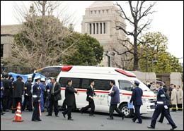 ![]() AP Photo/Kyodo News An ambulance awaits in front of the Japanese parliament building in Tokyo Wednesday where a man fatally shot himself. He was a reputed right-wing extremist, police say. |