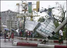 ![]() AP Photo An advertising board is seen fallen following a devastating cyclone Sunday in Myanmar. Officials announced more than 22,000 people were killed and as many as a million homeless. |