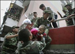 ![]() AP Photo/Wang Jiaowen, ColorChinaPhoto Rescuers carry a child out of building debris in China Tuesday. Crews continue to search for survivors after the country’s worst quake in three decades. |