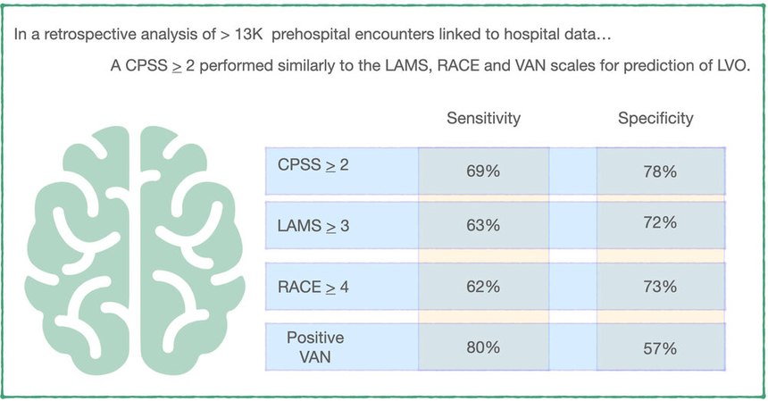 LVO screening tools of variable complexity have been developed. Depending on the complexity, implementation of such screening tools requires significant investment in training, documentation and tracking on the part of the EMS system. In general, the sensitivity, specificity and positive predictive value of all the LVO scales has been suboptimal [3]. In contrast, the Cincinnati Prehospital Stroke Scale (CPSS) is widely implemented and regularly performed by EMS clinicians at all scopes of practice. The objective of this paper was to address whether newly developed LVO scales offer a clinically-meaningful advantage over the CPSS.